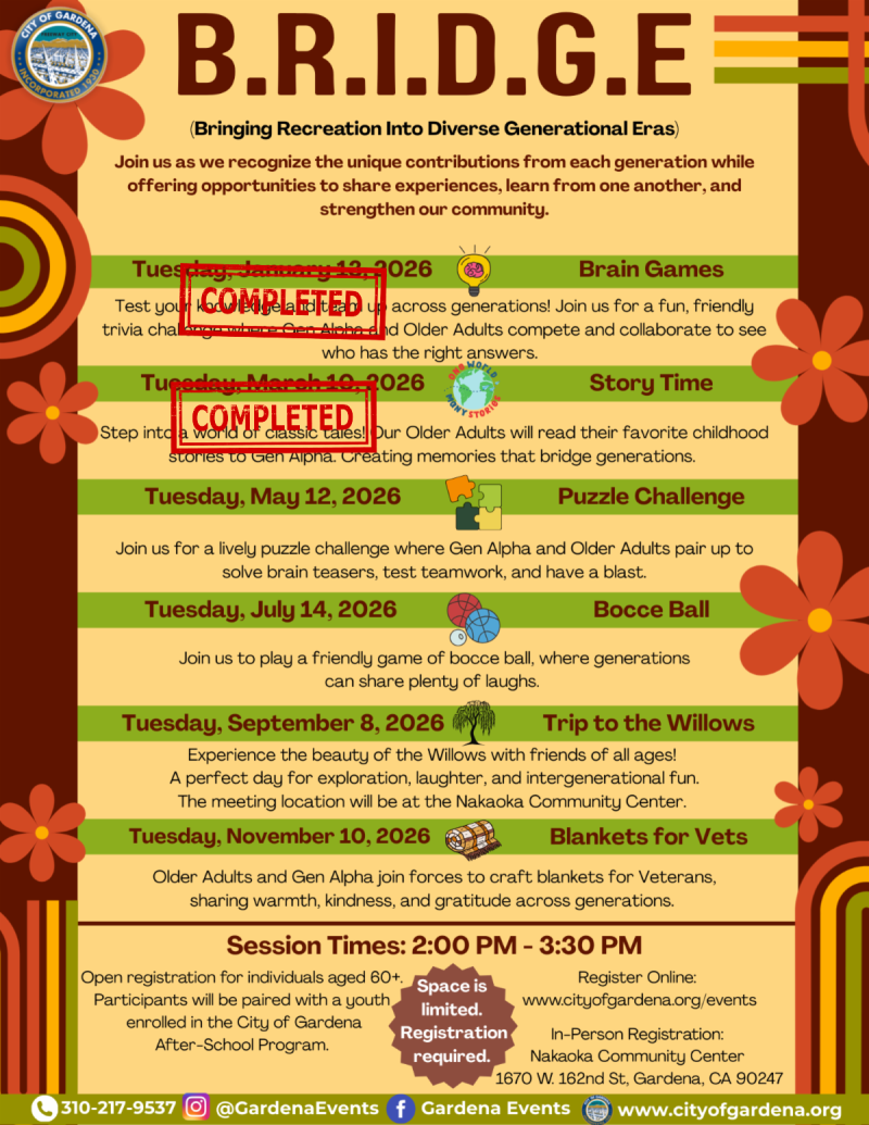 To register for the upcoming B.R.I.D.G.E. events, visit www.cityofgardena.org/events