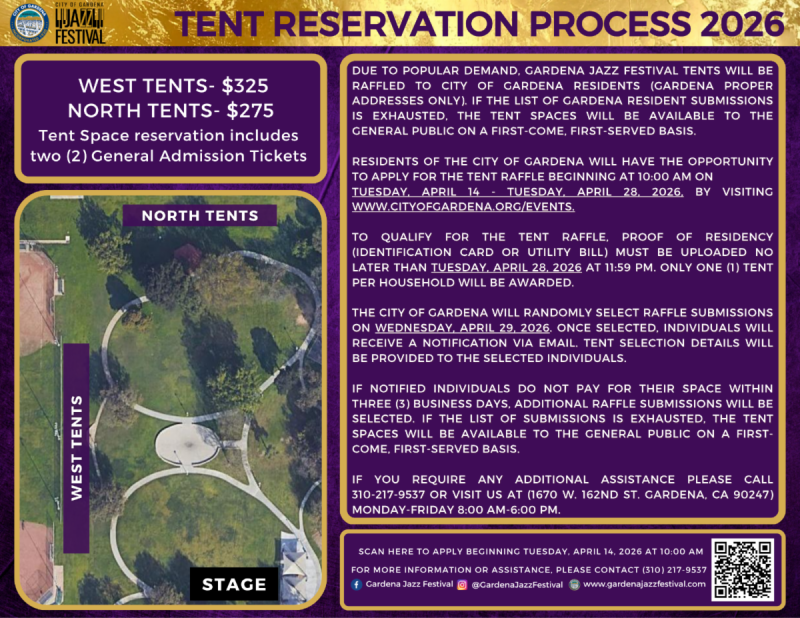Due to popular demand, Gardena Jazz Festival tents will be raffled to City of Gardena Residents (Gardena proper addresses only).