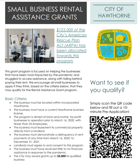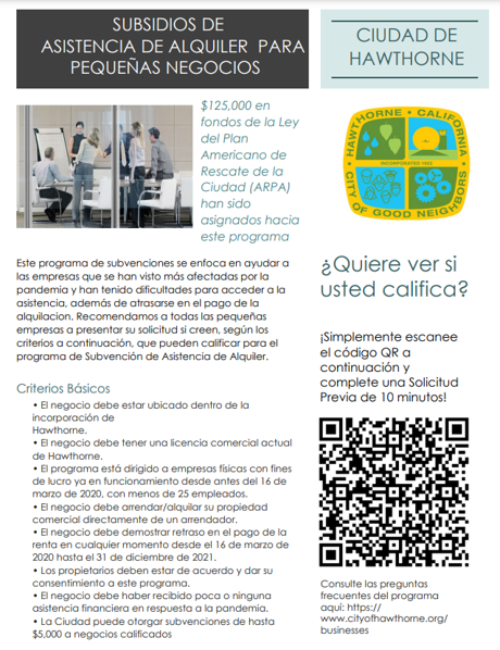 Para ver las pautas haga clic AQUÍ Para llenar la solicitud haga clic AQUÍ (la solicitud está en ingles) Una vez completado, cargue todos los documentos con la solicitud y envíelos por correo electrónico a CFB@cityofhawthorne.org |