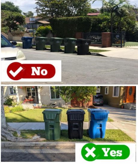 1) Do not place trash cans on the street. This prevents our street sweepers from cleaning our streets properly.