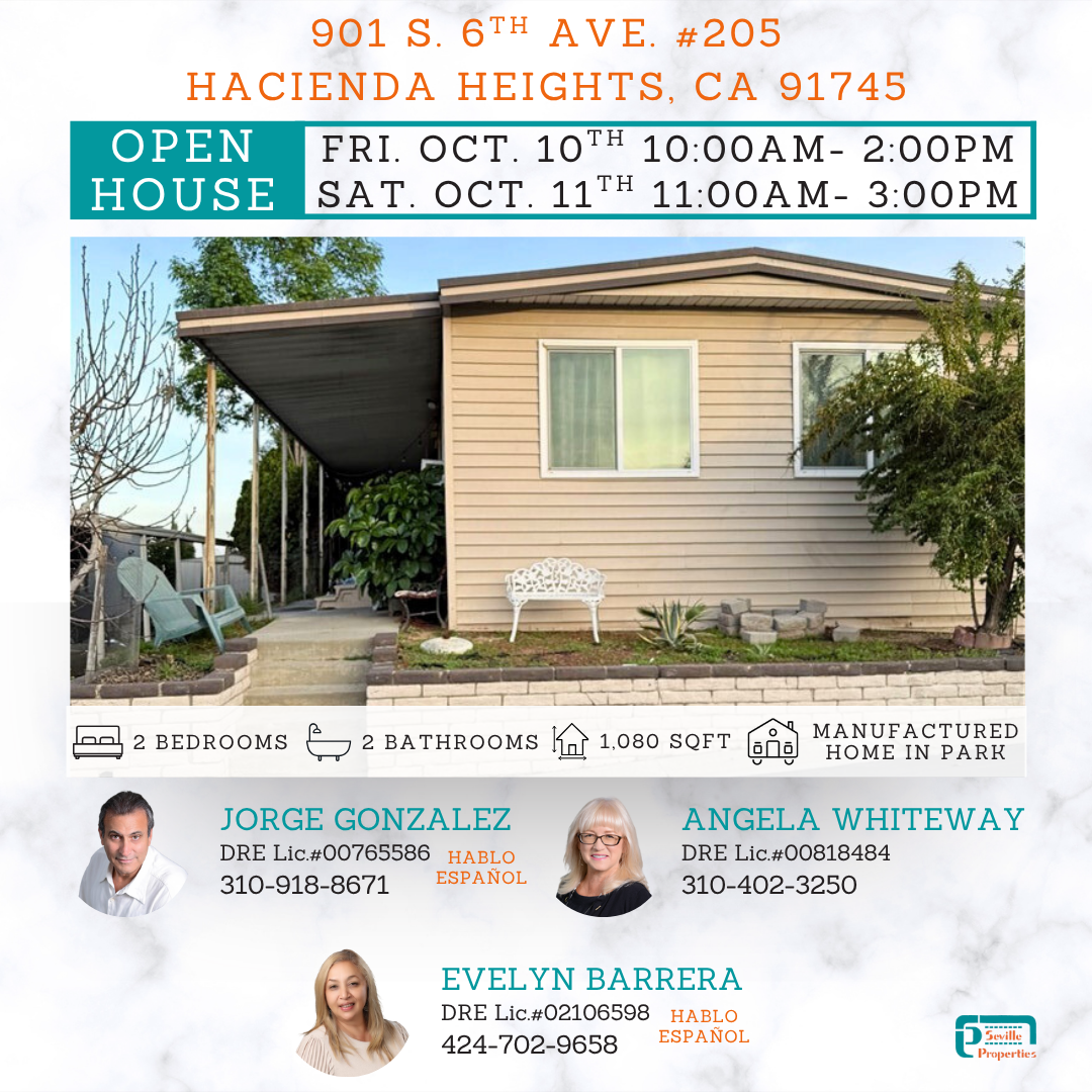 Looking for a home that combines affordability, charm, and location? This is your chance! Join us for an Open House this Friday, October 10th from 10 AM – 2 PM and Saturday, October 11th from 11 AM – 3 PM to tour a beautifully maintained manufactured home in the highly desirable Wildwood Park community of Hacienda Heights.